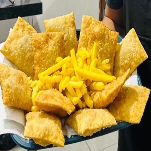 Massa de pastel, Salsicha, Mussarela, Tomate e Batata Palha